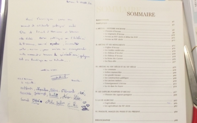 Pour la remercier d’être venue dans notre école, monsieur le Maire lui offrit le livre sur l’histoire de notre commune d’Andrée Coquillot et ajouta un mot sur la deuxième de couverture en son nom et celui des enfants qui le signèrent tous. Ce qui fit qu’elle aussi eut les autographes de tous les élèves de la classe !