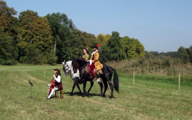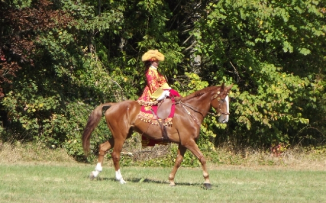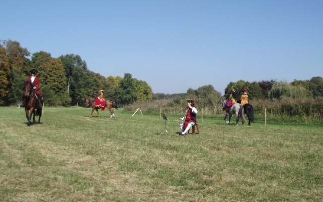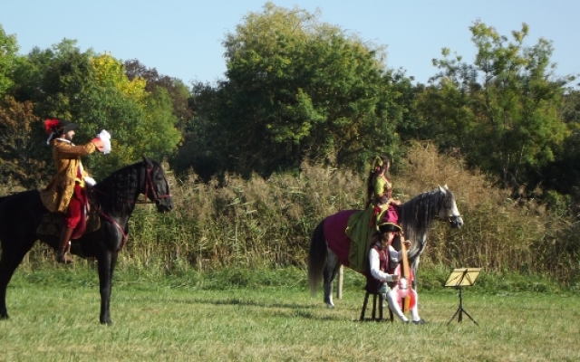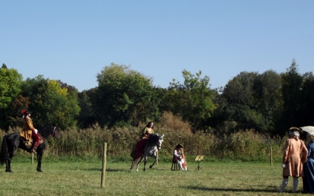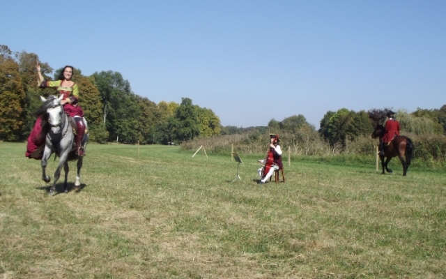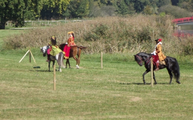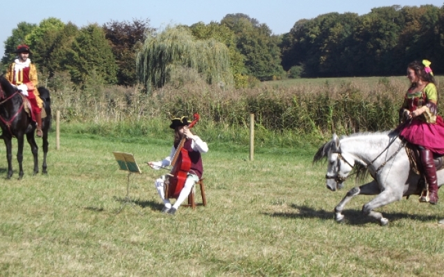 Nous eûmes droit à un splendide spectacle de dressage avec différents airs et allures comme le pas de travers qui permettait aux chevaux de défiler devant le public tout en restant de face. Cependant, il n’y en avait pas seulement pour le plaisir des yeux mais aussi pour celui des oreilles puisque le joueur de basse de viole était présent pour accompagner les cavaliers dont les montures se mirent à danser en couple. Le musicien fut remercié pour sa contribution par une gracieuse révérence équestre digne des dames de la cour du roi.