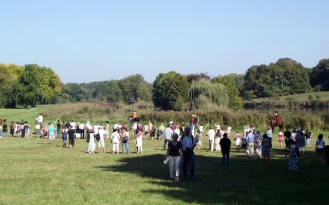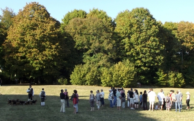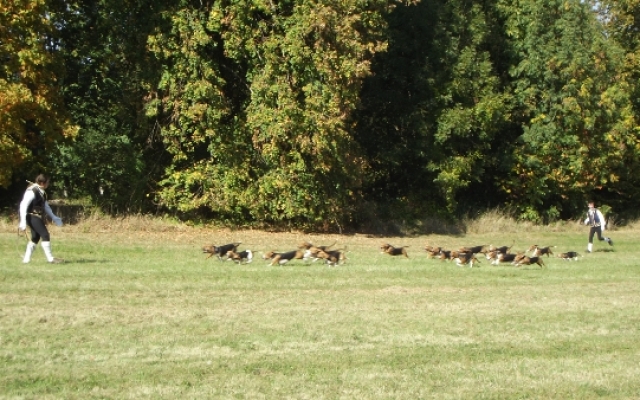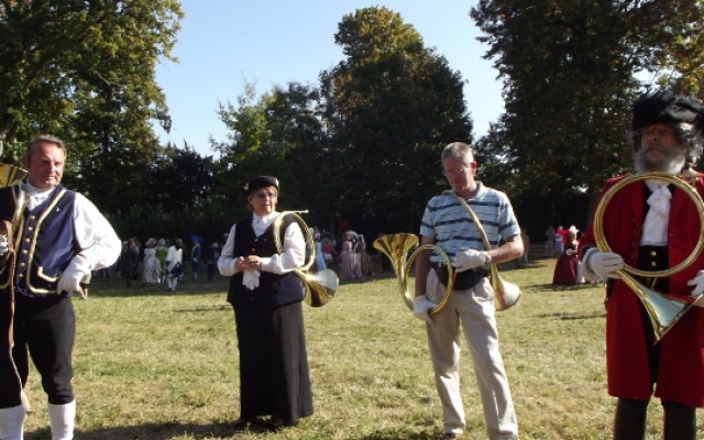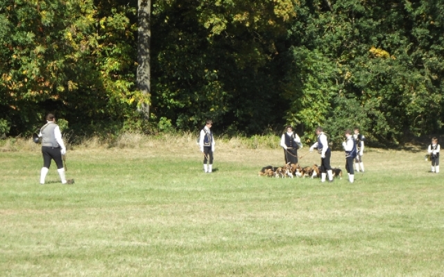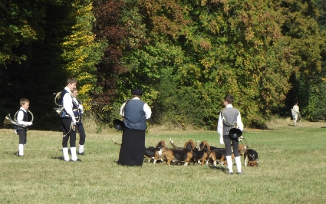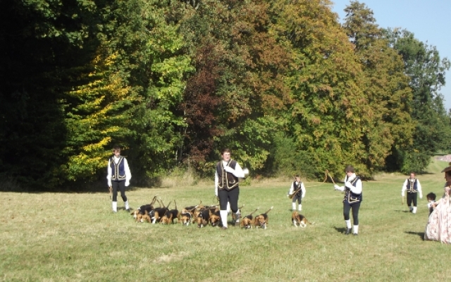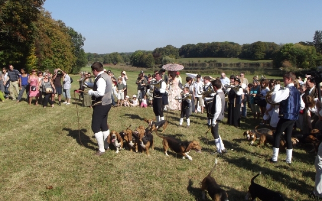 Pour le plus grand plaisir des touts petits comme celui des plus grands, les veneurs était venus accompagnés de toute une meute de jeunes bassets avides de caresses. D’ailleurs, le veneur eut toutes les peines à tenir ses petites bêtes affectueuses devant une telle affluence de personnes. Ce qui ne l’empêcha pas de faire ses démonstrations une fois que le public se mit à bonne distance. Parés de leurs costumes du XVIIIe siècle, Tous les veneurs présents avaient la particularité d’être équipé d’un instrument de musique : la trompe de chasse. Une fois de plus les animateurs furent généreux en explications, saviez-vous que la trompe de chasse est un instrument issu de la vénerie française ?